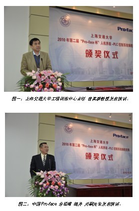 全球人機界面領導廠商Pro-face繼2009年與上海交通大學合作成立“上海交通大學-Pro-face人機界面與PLC可視化控制實驗室”,并成功舉辦首屆“Pro-face杯”人機界面-PLC控制系統編程競賽活動之后。2010年雙方繼續深入合作,將先進的人機界面技術和工業自動化應用在上海交通大學進行實踐教育,在對學生進行人機界面基礎知識和編程技能的集中培訓后,2010年11月28日,在上海工程訓練中心成功舉辦了2010年第二屆“Pro-face杯”人機界面-PLC控制系統編程競賽。上海交通大學教務處副處長高捷教授、工程訓練中心主任曹其新教授及相關領導和中國Pro-face細井元嗣總經理出席了競賽頒獎儀式,曹其新教授和細井元嗣總經理分別代表上海交通學校和Pro-face發表了演講。